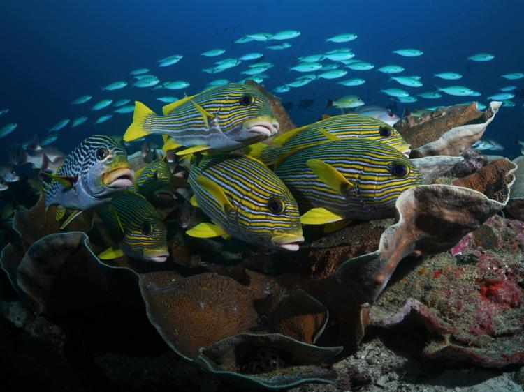 Sweetlips hanging out on coral bombie