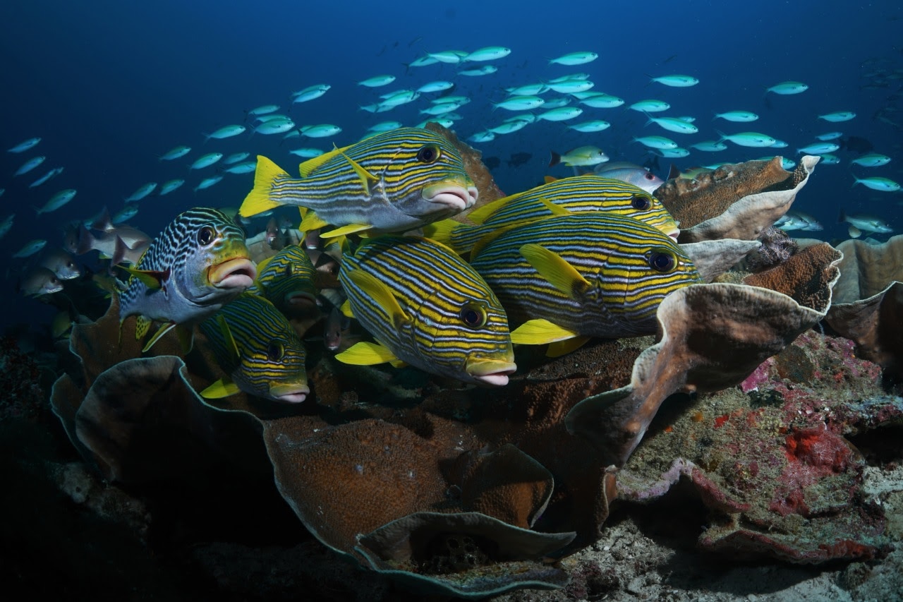 Sweetlips hanging out on coral bombie
